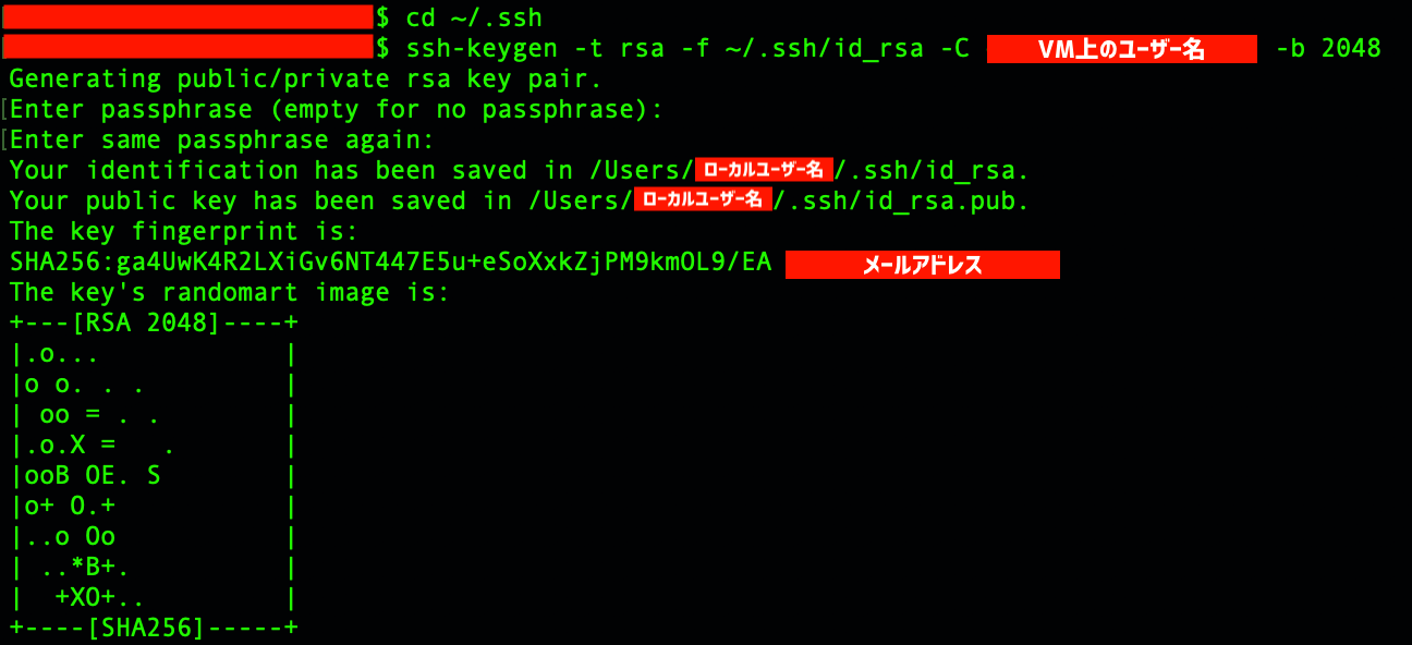 このディレクトリの中にsshキーを作成していくけど、GoogleCloudでsshキーの作成方法があるので、これをもとに生成していく。[USERNAME]はVM 上のユーザー名になるので、Gmailでアカウントを作成した場合はxxxxx@gmail.comのxxxxxの部分になる。