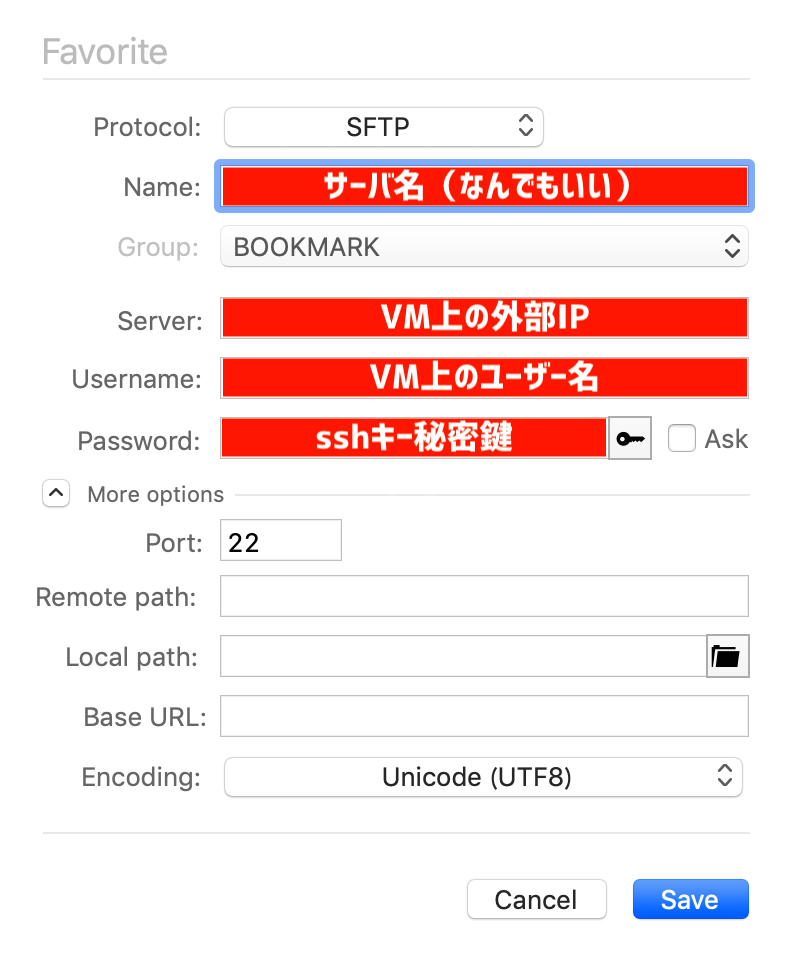 FileZillaやCyberduckなどのSFTPクライアントにSFTP情報を入れていく。以下はForkliftの例でサーバー名、サーバーアドレス、ユーザー名、パスワードで接続が出来るようになる。