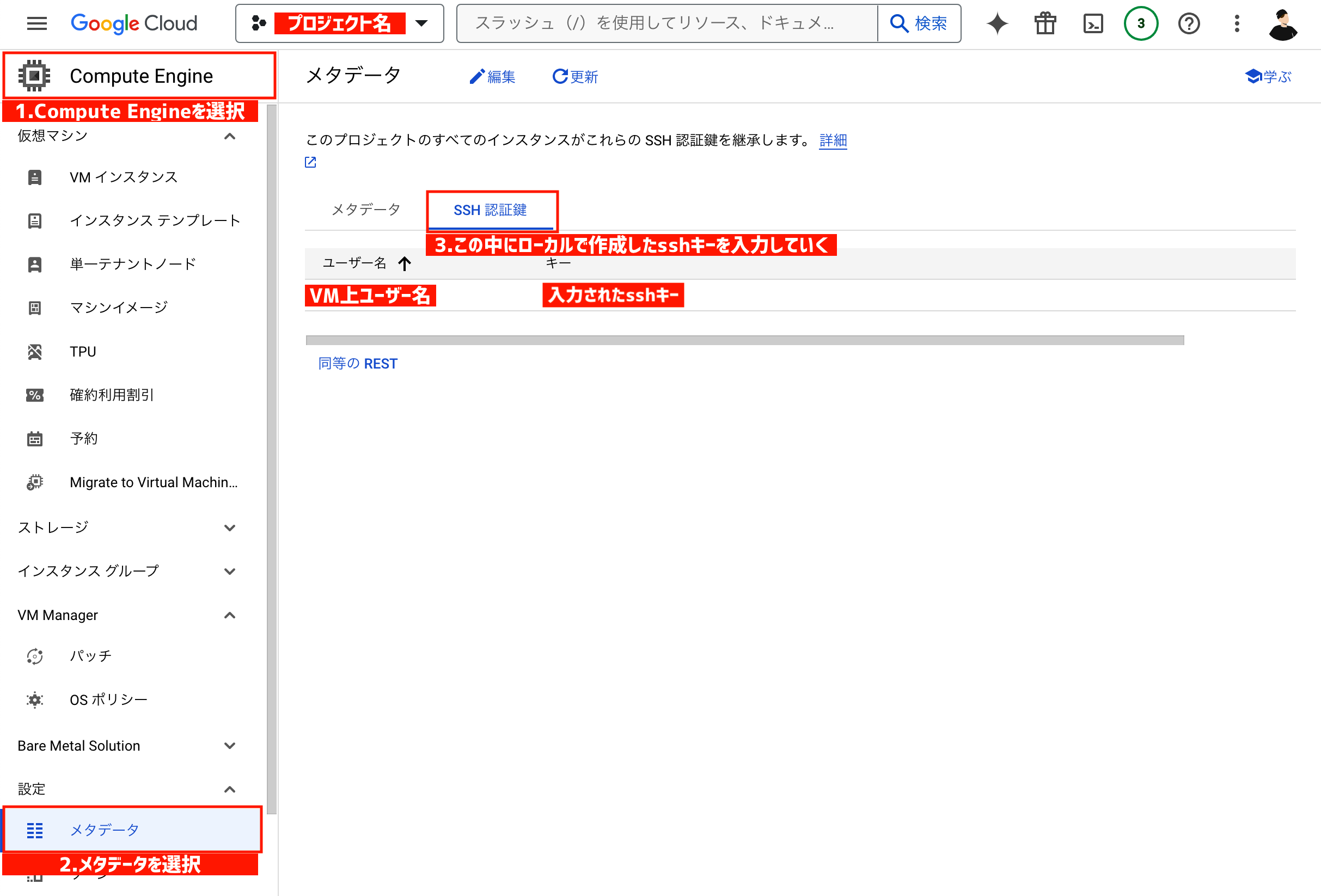 GoogleCloud側でSSHキーの入力項目があるメタデータが用意されているので、以下の順番で更新していく。